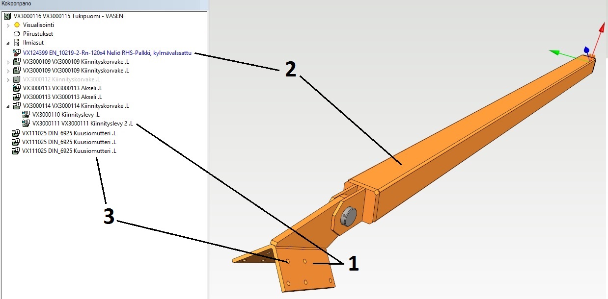 Kokoonpanossa piirustusnumerolliset osat näkyvät piirrepuussa loppuliitteellä ".L".