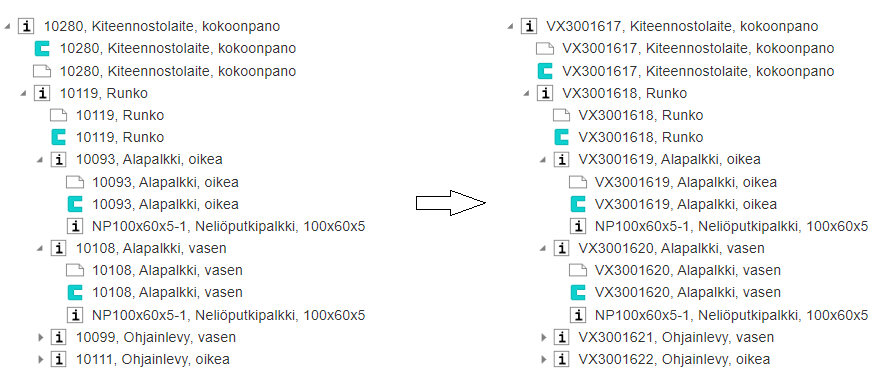 Kopioi tuoterakenne uuden pohjaksi niin,että kopioidut osat saavat uudet tunnukset tarvittaessa.
