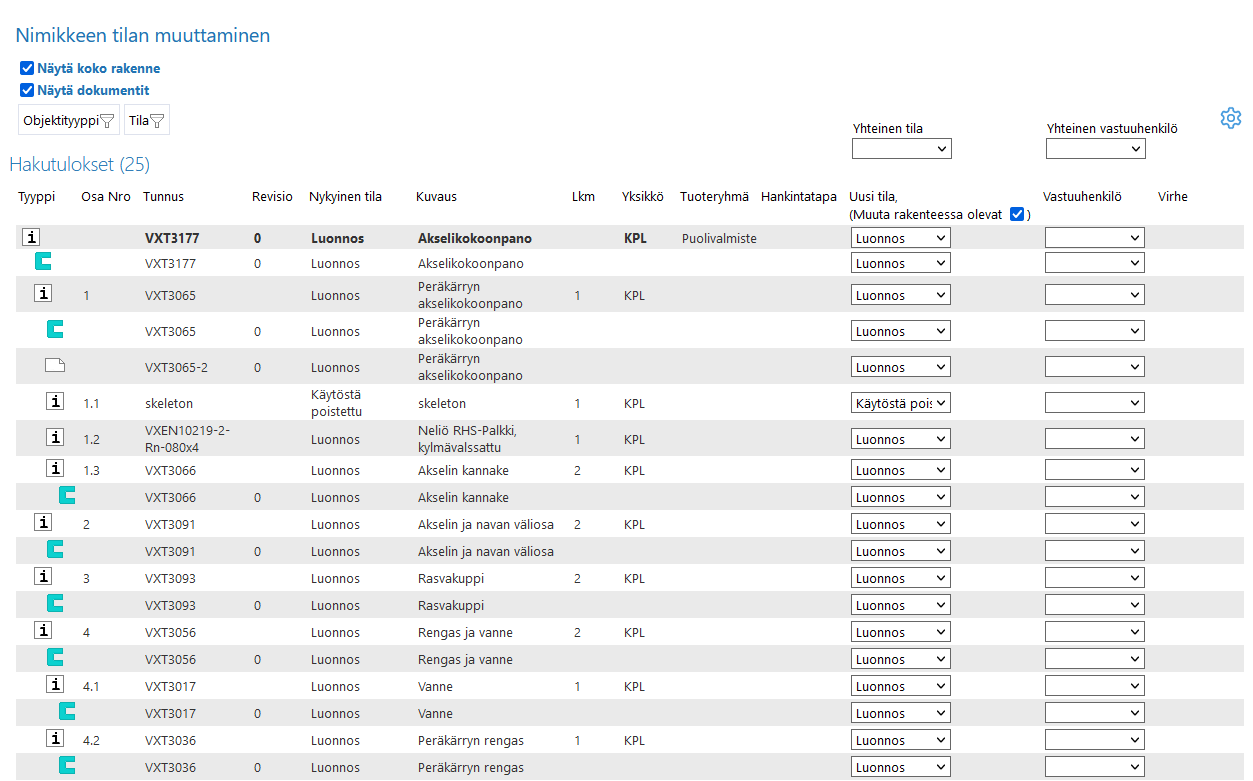 Voit vaihtaa nimikerakenteiden piirustusten ja mallien tilat samalla, kun vaihdat nimikkeiden tilat.