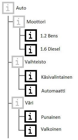 - Geneerisenä nimikkeenä voi olla vaikkapa auton "vaihteisto", jonka alla on valittavissa "manuaali" tai "automaatti". Tässä siis "vaihteisto" ei vielä kuvaa mitään yksikäsitteistä todellista tuotannossa olevaa nimikettä, kun taas kumpikin sen alla oleva vaihtoehto on oikea fyysinen nimike. Alla kuvan muodossa geneerisiä ja "oikeita" nimikkeitä auton tuoterakenteessa: