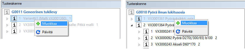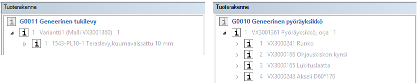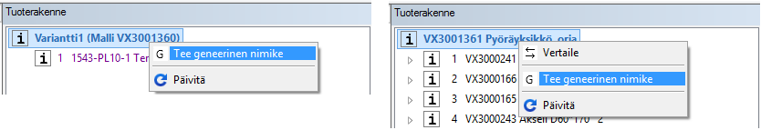- Vertex G4:llä geneerinen nimike voidaan perustaa olemassa olevalle nimikkeelle "Tuoterakenne"-puun avulla tilannekohtaisella toiminnolla "Tee geneerinen nimike".
