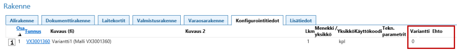- Täytetään Konfigurointi-välilehdelle joko "Variantti" tai "Ehto"-kenttä. (Ehto liittyy myynti-konfiguraattorin tekemiseen, joten Variantti-kentän käyttäminen on yleisempää).