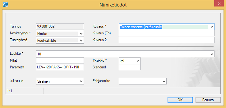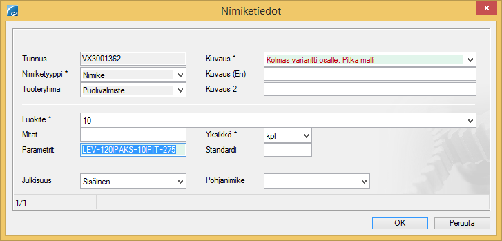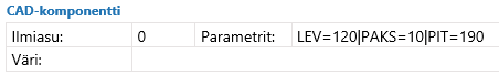 - Jos uusi (osaa kuvaava) nimike sisältää yksilölliset mitat, niin "CAD-komponentti" otsikon alla olevaan kohtaan "Parametrit:" laitetaan mittamuuttujat putkimerkeillä eroteltuna, esim: PIT=100|LEV=60|PAKS=10.