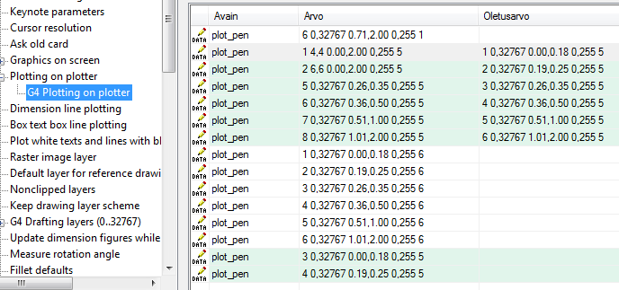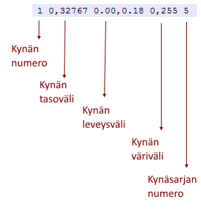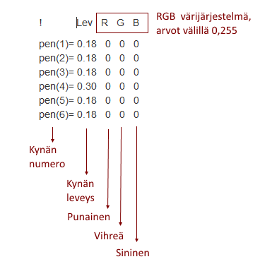 Arvo: Kynän parametrit. Huomaa parametrit erotellaan välilyönnillä, esim. parametri 0.00,0.18 tarkoittaa kynän leveysväliä.