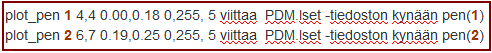 Tulostuksessa tulostusparametreja luetaan kynän numeron mukaan pienimmästä suurimpaan. Ohjelma käyttää PDM.lset tiedostosta sitä kynän numeroon yhdistettyä leveyttä ja väriä, joka ensimmäisenä täsmää plot_pen -parametriin.