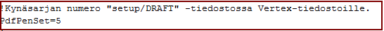 ! Kynäsarjan numero "setup/DRAFT" -tiedostossa Vertex-piirustuksille. ! Oletus=5. Jos halutaan oletuksena kaikki piirustukset värillisinä PDF-tiedostoina, kynäsarja on -1
