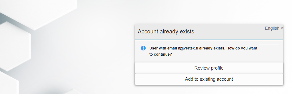 Jos saat vielä selaimeesi ilmoituksen Account already exists, jatka eteenpäin valitsemalla Add to existing account ja verifioi sähköpostiosoitteesi vielä kerran.
