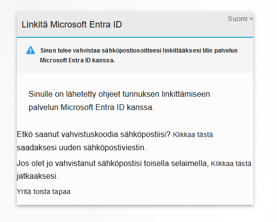 Sähköpostiin tulee aina uusi pyyntö, jossa pyydetään vahvistamaan tilien linkitys ja selaimeen avautuu ikkuna, jossa pyydetään oheisen kuvan mukaista linkittämistä. Katso oheinen kuva,