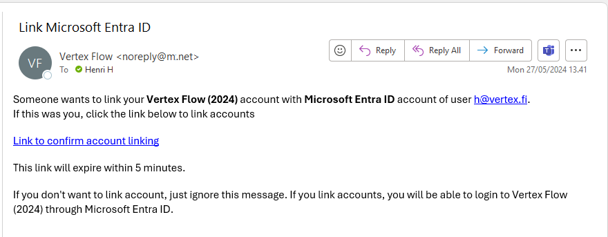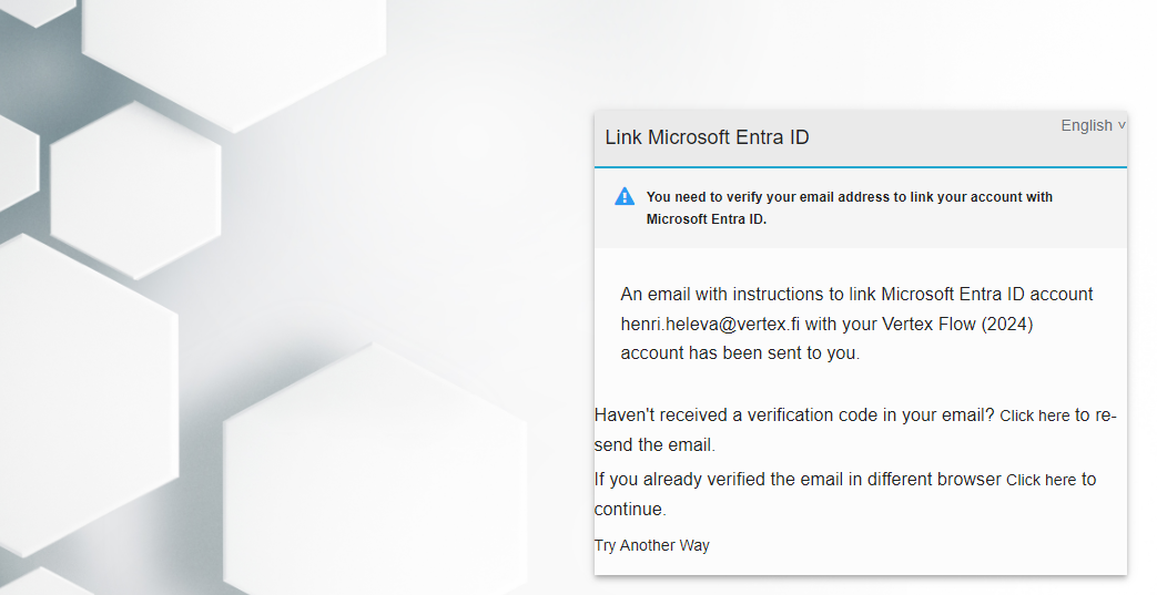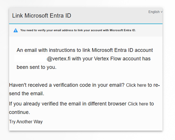 Saat Flow-järjestelmältä sähköpostin, jossa pyydetään sinua päivittämään Vertex Flow -tilisi ja vahvistamaan sähköpostiosotteesi. Tämä edellyttää sitä, että sähköpostiosoitteesi on määritelty Vertex Flow -järjestelmässä ja sama sähköpostiosoite on määritelty myös Entraan.