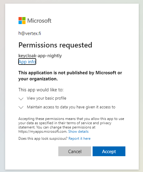 Hyväksy Keycloakin pyyntö päästä käyttämään tiettyjä Entra-tilisi tietoja