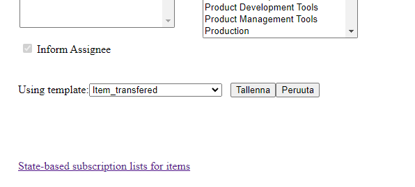 Mun tyyppisillä objekteilla, esimerkiksi dokumenteilla, viestin lähetys määritellään samalla tavalla. Kuitenkin nimikkeiden tapauksessa pitää valita Notifications-sivulta State-based subscription lists for items