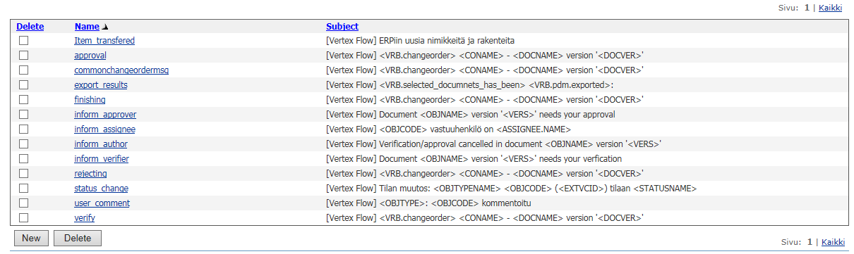 Työkiertoa määrittäessäsi voit käyttää viestipohjia inform author, inform verifier, inform approver. Vastuuhenkilön sähköpostipohja on inform assignee.
