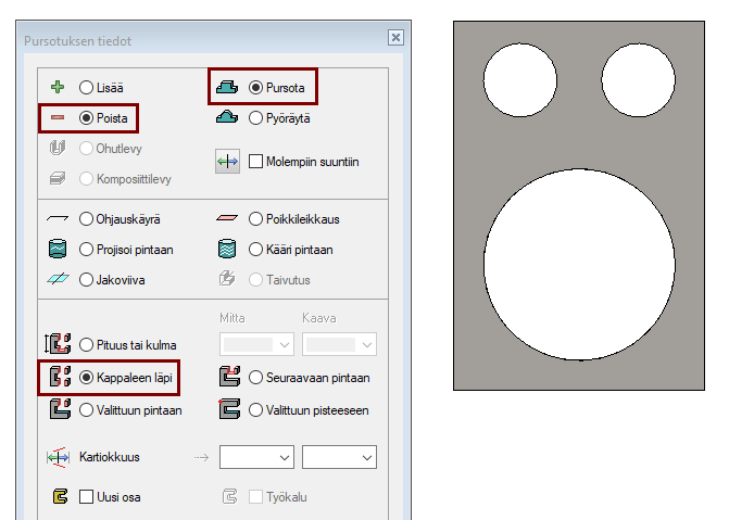 Kappaleen läpi: Ei riipu kappaleen paksuudesta, pursotetaan läpi.