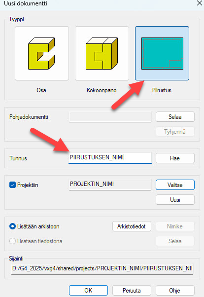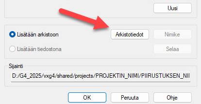 Vertex-piirustukset tallennetaan pääsääntöisesti aina arkistoon, joten pidä valintanappi Lisää arkistoon aina valittuna.
