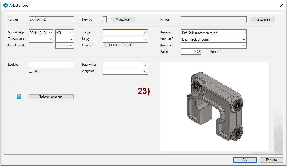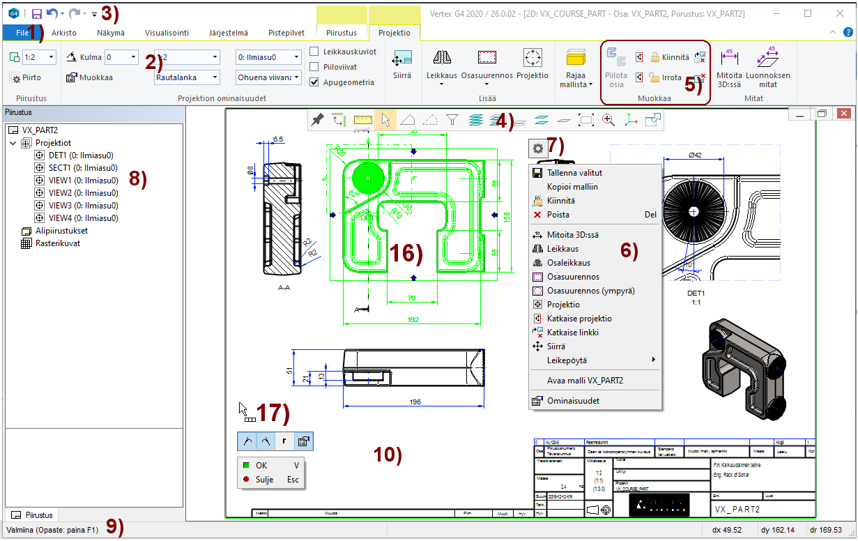 - Mallin piirustuksissa määrätyistä suunnista näkyvät "Kuvannot", myös osasuurennos- ja leikkausprojektiot.