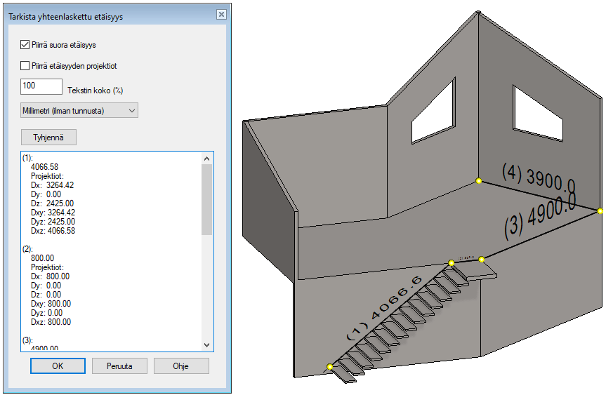 Valitse Piirrä etäisyyden projektiot, jos haluat, että osoitettujen elementtien (piste, viiva tai pinta) välille piirretään pääakseleiden suuntaiset viivat ja niille lisätään mitat.