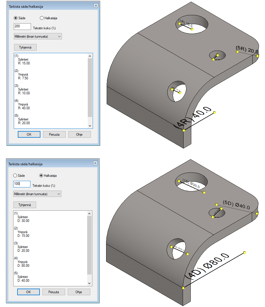 Toiminto avaa dialogin Tarkista säde/halkaisija.