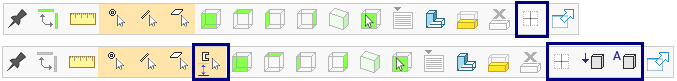 Piirustuksen työkalunauhassa on muutamia samoja toimintoja, joita löytyy mallinnuspuolelta (kehystetty sinisellä).