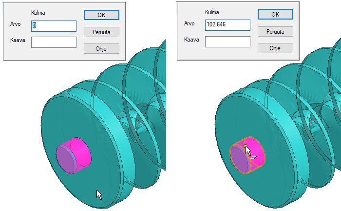 -näppäin pohjassa ja liikuttele kohdistinta lieriöpinnan päällä. Huomaat että kulman arvo muuttuu vasemman yläkulman dialogissa.