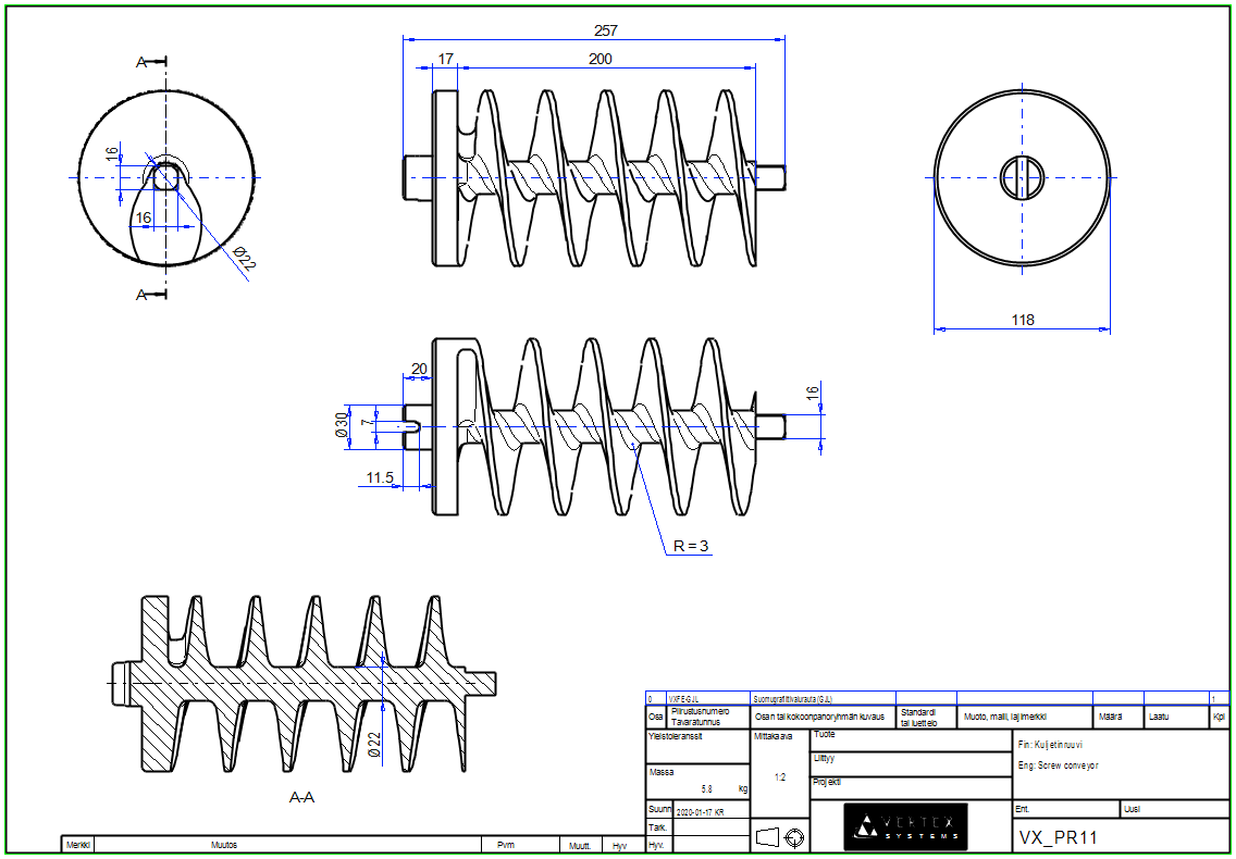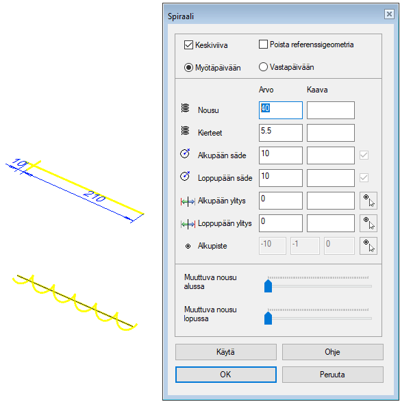 Jos spiraalin lähtökohtana olisi esim kartio, niin optiolla Poista referenssigeometria, lieriö poistetaan, kun spriraali syntyy kartion pinnalle.