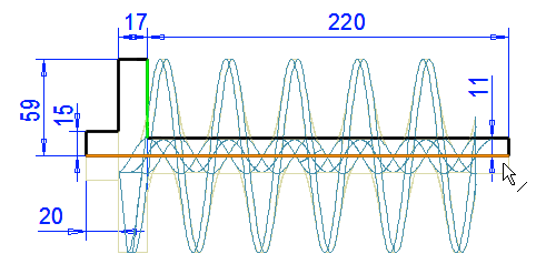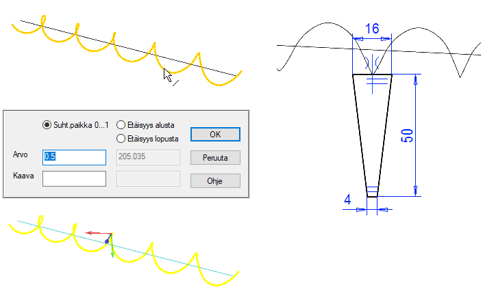 Optiolla Keskiviiva, ohjelma piirtää lieriö- tai kartiopinnalle sijoitetulle spiraalille keskiviivan (lieriön tai kartion pyörähdysakselin kohdalle).