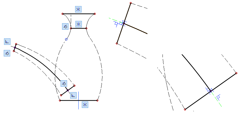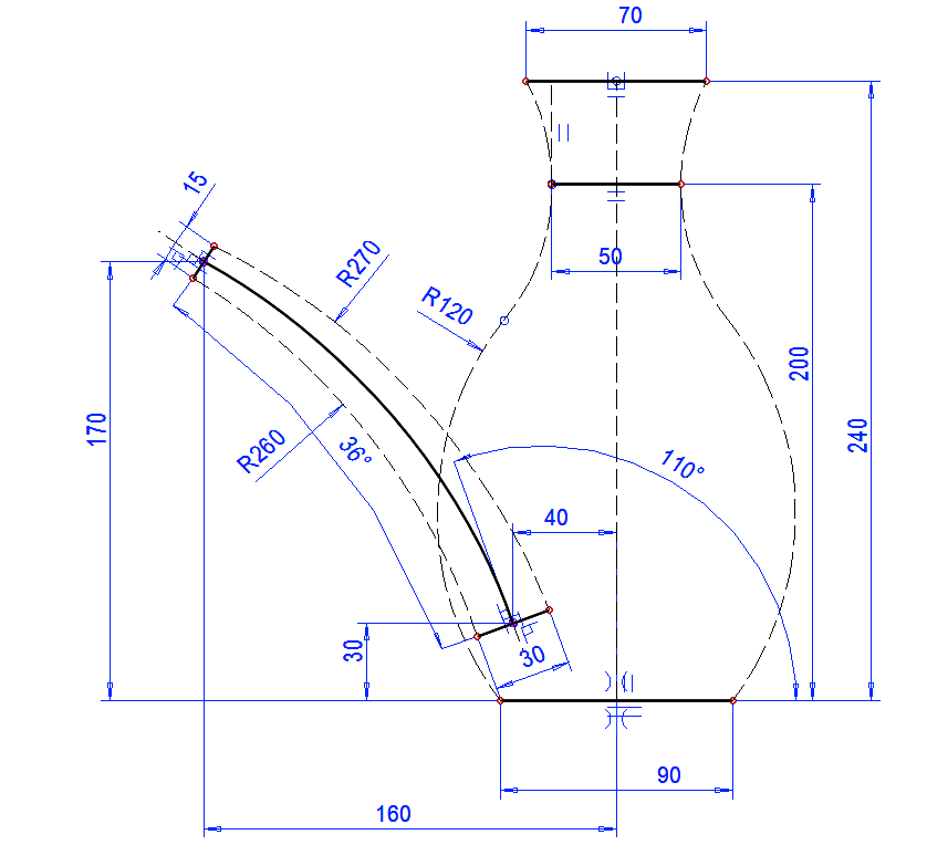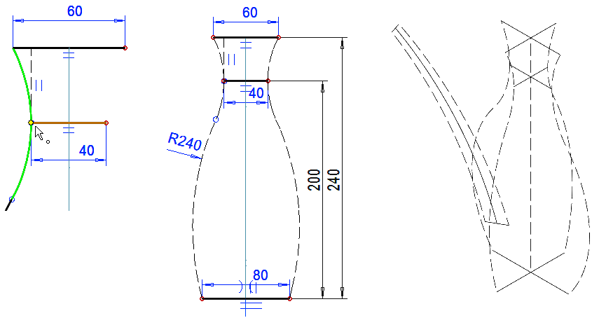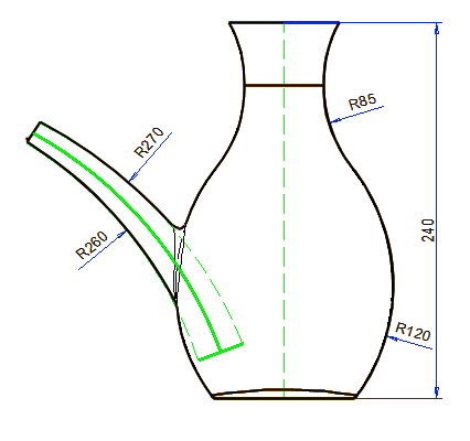 Piirrä vielä kannun symmetria-akseli, mutta piirrä se kahtena erillisenä janana, jotta saat geometriaan pisteen toiseksi ylemmän muotoviivan risteyskohtaan