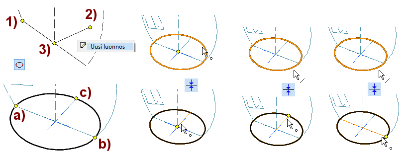 Osoita ellipsin pääakselin pisteen, kuvassa a) ja b) sekä sen jälkeen ellipsin leveyden määrittävä piste, kuvassa c).