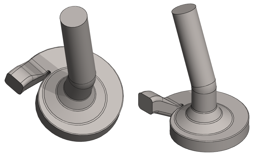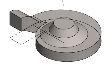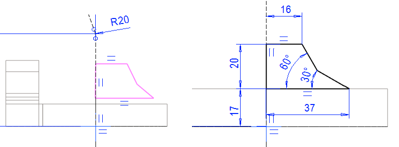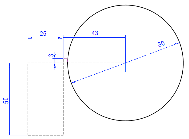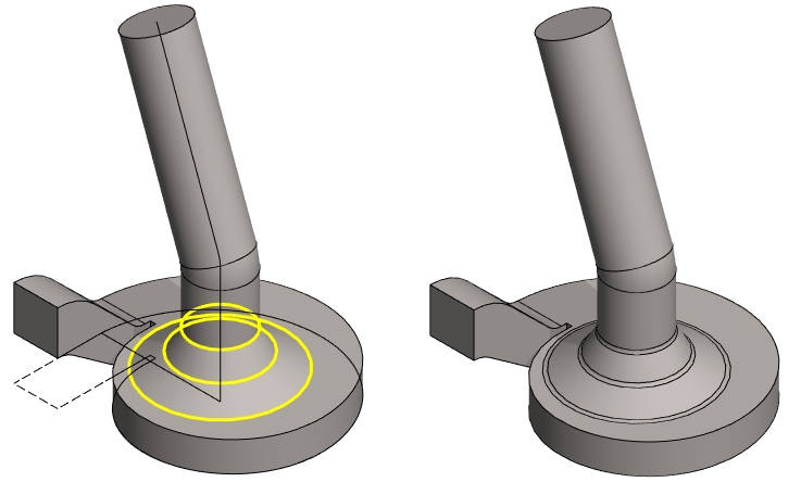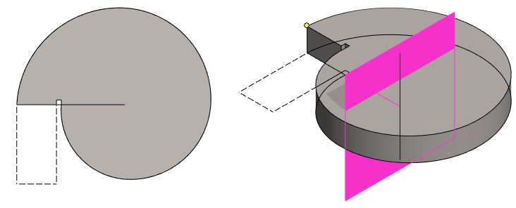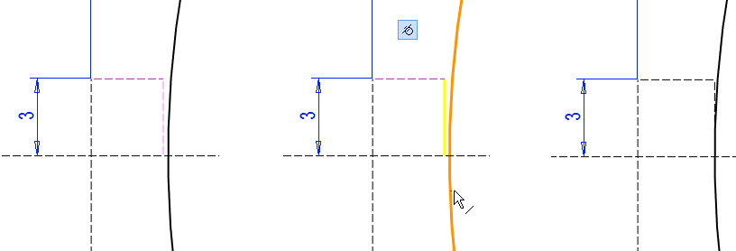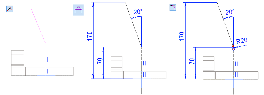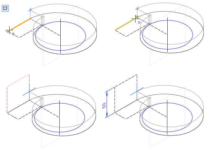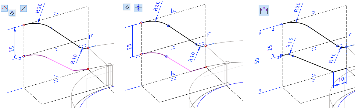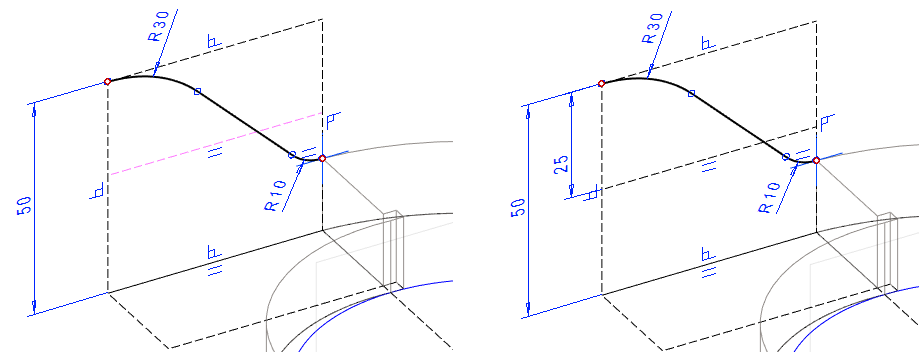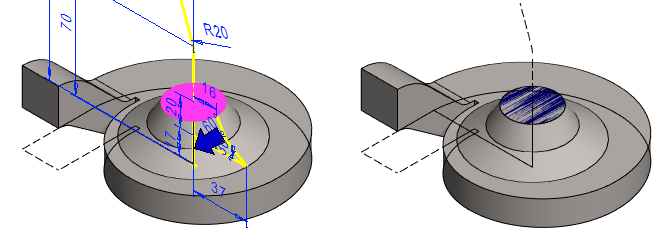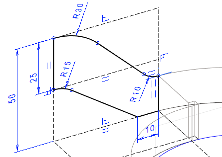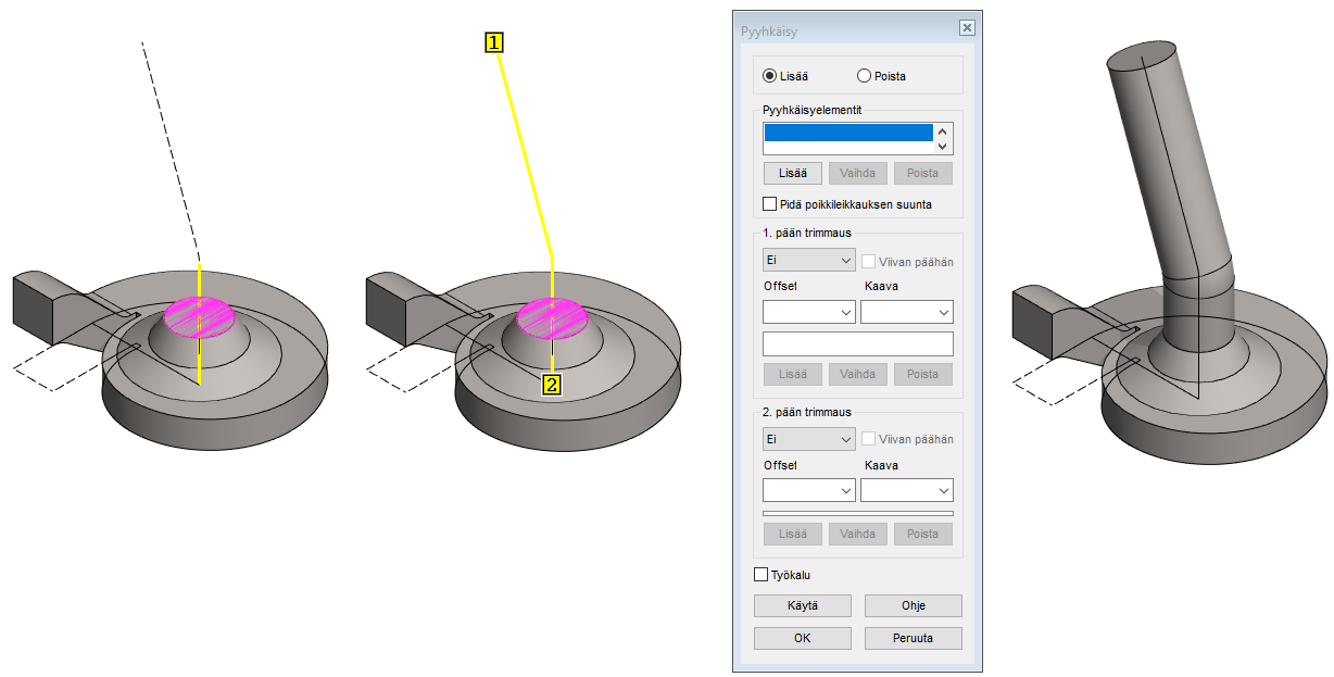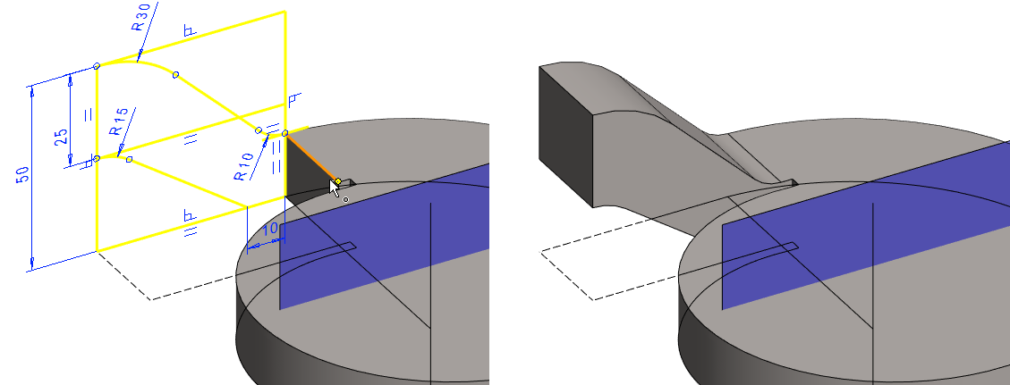 Mallissa olevaa pintaa ei voi käyttää pyyhkäisyyn. Pyyhkäisyä varten tarvitaan erillinen poikkileikkaus ja ohjauskäyrä. Tässä tehdään poikkileikkaus luonnospiirteen avulla, jolloin poikkileikkauksen koko muuttuu, jos edellisen vaiheen kartion mitta muuttuu.