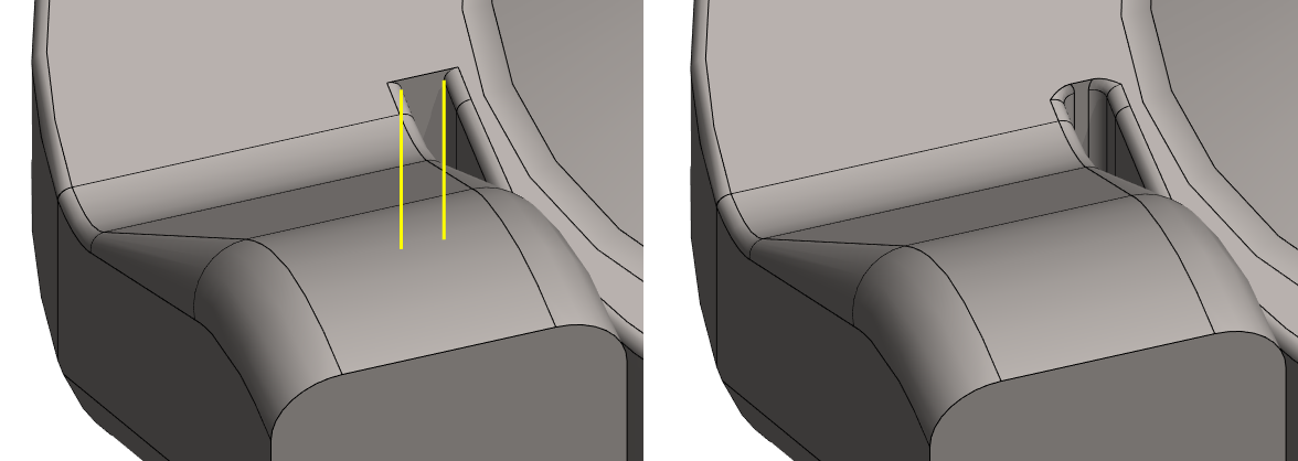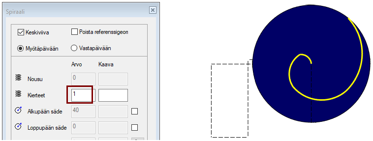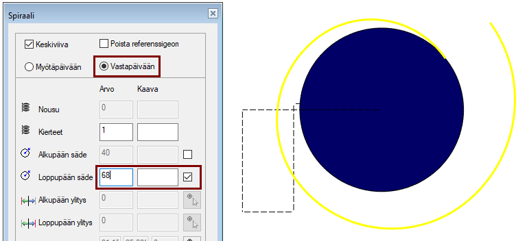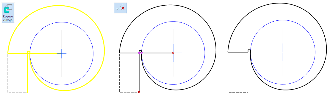 Koska valittu spiraaliviiva ja sen päissä kiinni olevat viivat eivät ole toisiinsa nähden tangentiaalisia, niin ohjelma ei itse löydä viivaketjua eteenpäin, joten ohjelmalle täytyy osoittaa jatkoviivat.