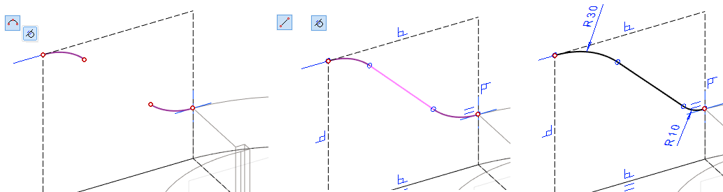 Piirrä kaksi tangentiaalista kaarta toiminnolla: Kaari (kolme kehäpistettä).