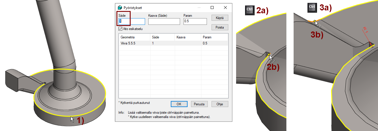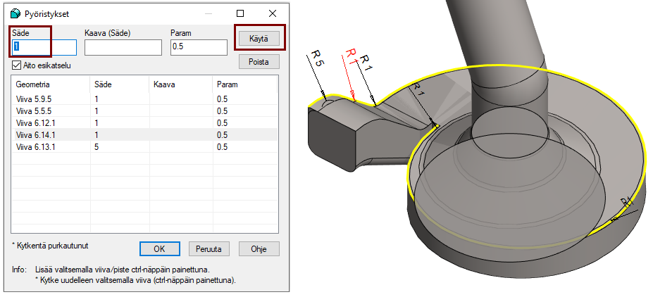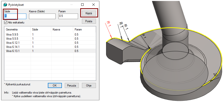 Paina Käytä-painiketta (jotta pyöristys jää talteen ja samalla pyöristyksen luonti testataan ja pyöristys piirretään malliin jos se onnistuu).