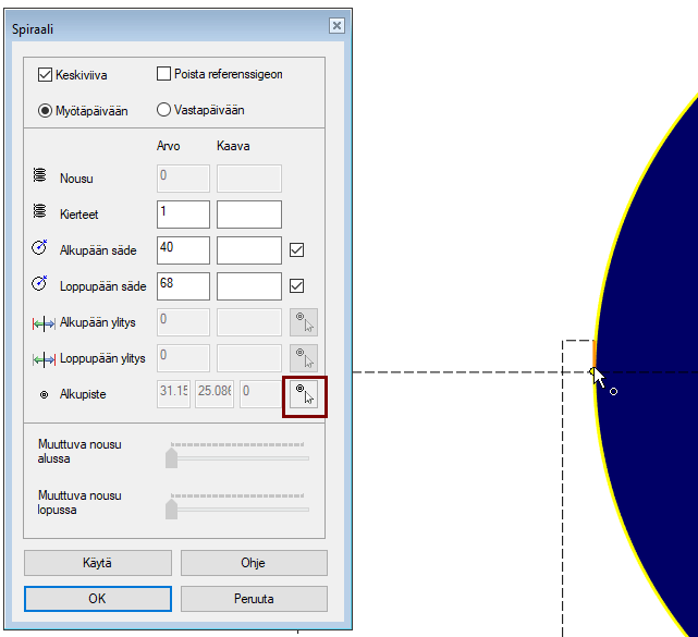 Tässä Käytä-painikkeen painallus ei ole pakollista, jos uuden säteen arvon syötön jälkeen valitset OK-painikkeen.