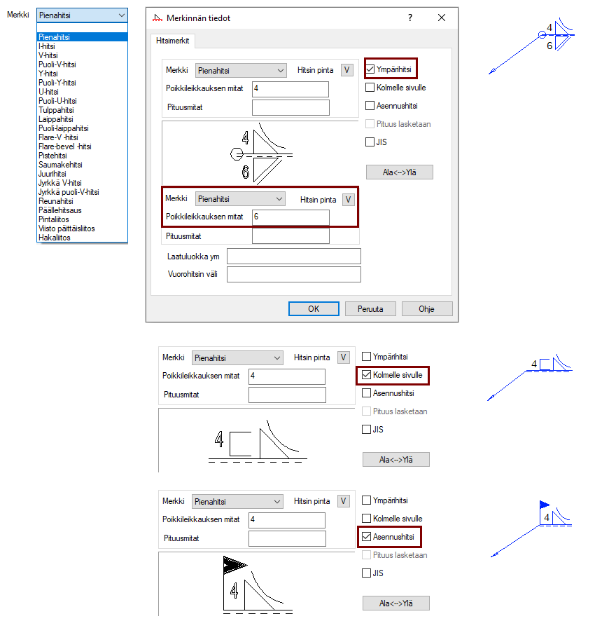 Katso ohjeet edellä esitetystä kohdasta Lisää hitsausmerkki, jossa on kaksi nuolta.