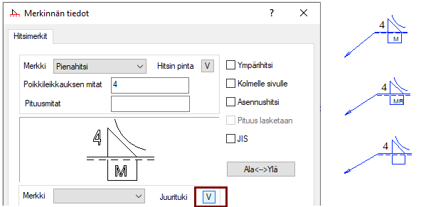 Yksipuoliseen hitsiin voit lisätä juuritukimerkin toiminnolla Juurituki.