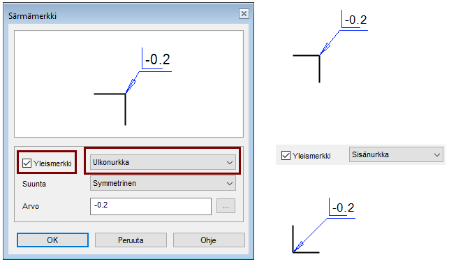 Merkit sopivat sekä ulkosärminen ylityöstön tai sallitun jäysteen merkintään ja sisäsärmien yli- ja alityöstöjen merkintään.