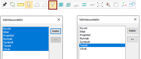 Jos valintasuodattimessa on mukana Tekstit,niin voit valita koneen suunnittelun merkkejä ja ne "tarttuvat mukaan" aitaamalla tehtyyn valintaan.