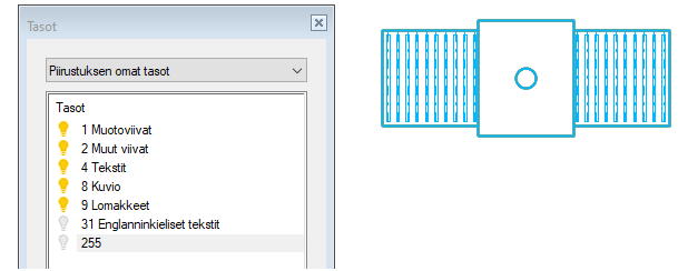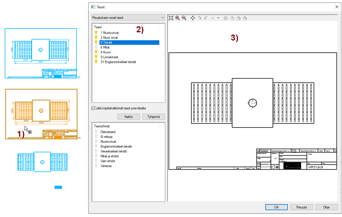 Vaihtoehtoisesti voit valita ne tasot, joden elementit näytetään. Huomaa: Alipiirustuksesta kannattaa ottaa useinmiten mukaan vain viivat ja muut viivat (tasot 1 ja 2). Pääsääntöisesti pois kannattaa jättää ainakin tekstit (tasot 4 ja 31), mitat (taso 6) ja lomakkeet (taso 9).