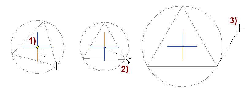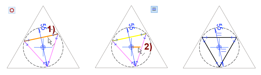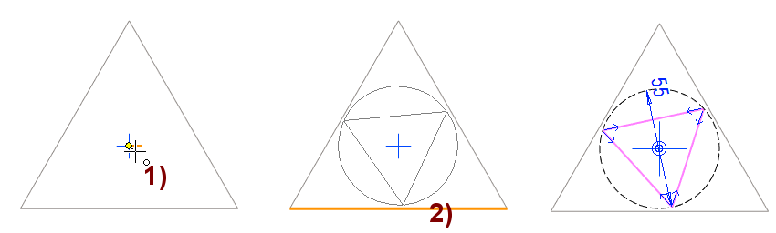 Jos olisit valinnut piirtotavaksi Sisähalkaisija tai Ulkohalkaisija, kolmas osoitus tarvitaan "naulaamaan" kolmio paikoilleen.