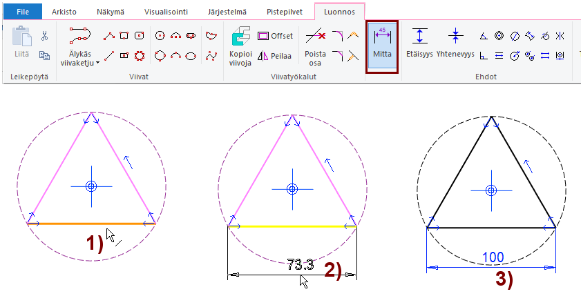 Ohjelma skaalaa kolmion oikean kokoiseksi ja lisää Etäisyys-ehdon. kuvassa 3).