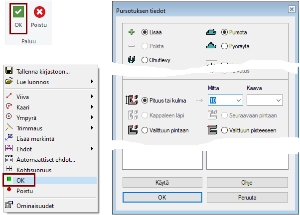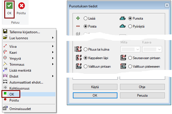 Ohjelma hyppää valikkoon Pursotuksen tiedot.