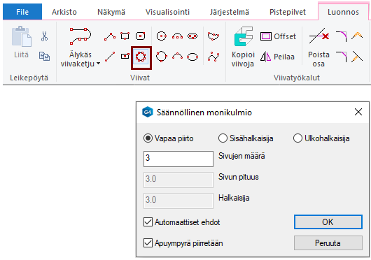 Ulkohalkaisija: Voit antaa joko monikulmion ympäri piirretyn ympyrän halkaisijan tai vaihtoehtoisesti yksittäisen sivun pituuden.