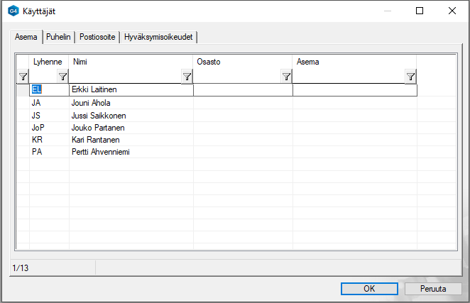 Käyttäjätietokannan avulla voimme hakea nimemme tai lyhenteen (puumerkin) mallien-, piirustusten- ja projektien arkistokortille, eli vältymme kirjoittamiselta.