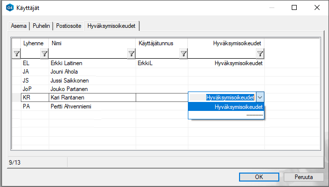 Valitse ao. sarakkeessa Hyväksymisoikeudet.