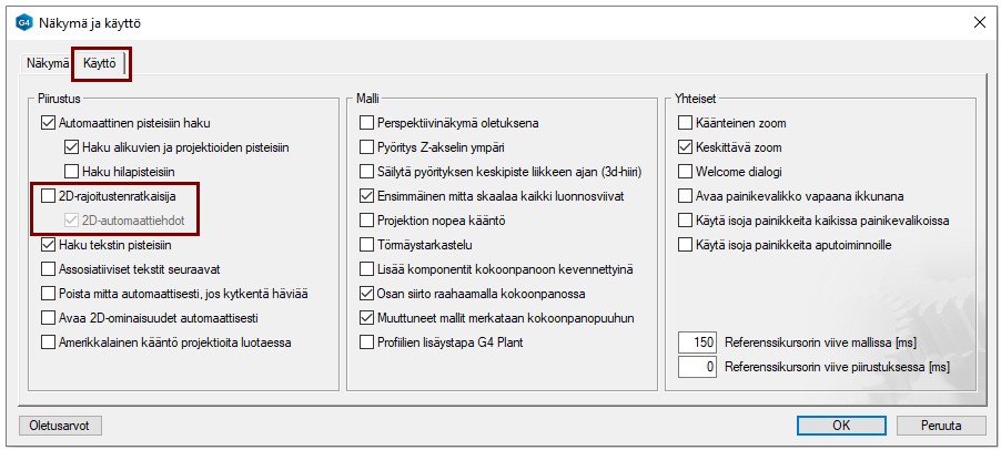 Älykkään viivaketjun piirtoon (ohjelma ehdotuksia ja 2Dehtoja, jos ehdot ovat päällä) voit vaikuttaa asetuksilla.
