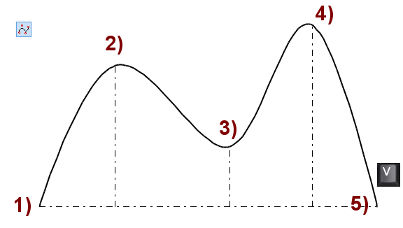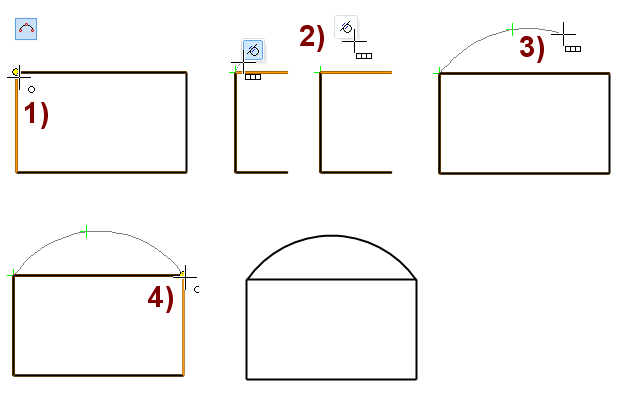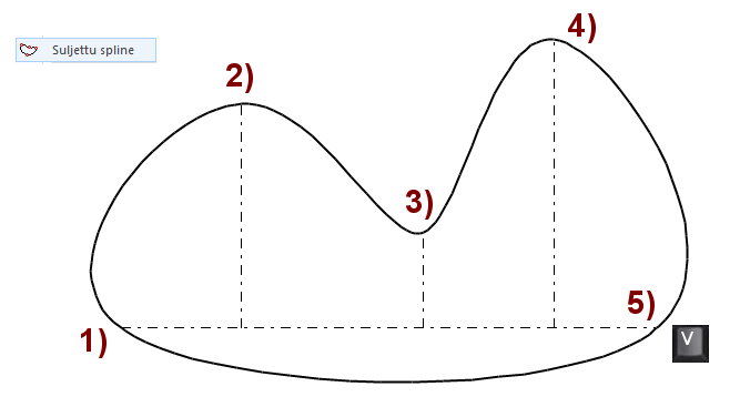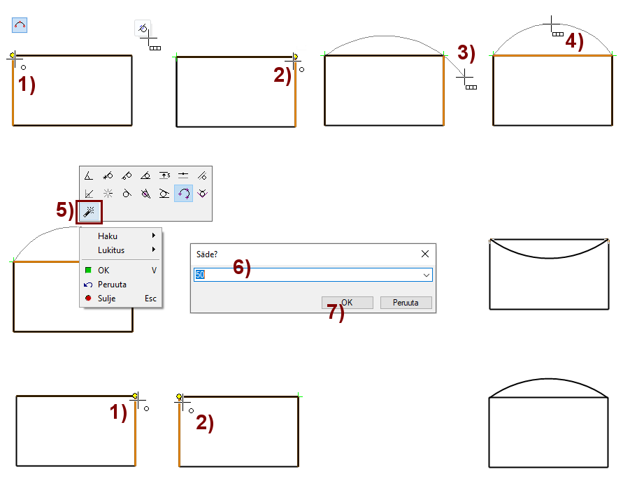 Kuvassa kaarelta lähtevälle viivalle on osoitettu vaakalukitus 2) ja sen jälkeen päätepiste.