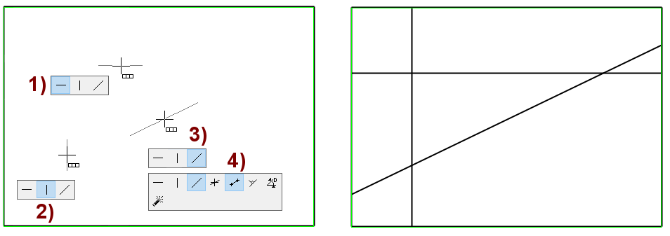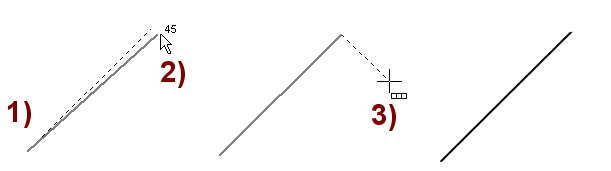Siirrä kohdistinta vinosti ylös (tai alas), kunnes näet kohdistimen vieressä 45°-symbolin ja samansuuntaisen katkoviivan. Napsauta tällöin kohdistinta 2).