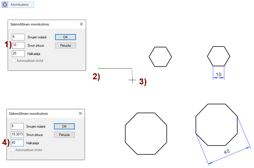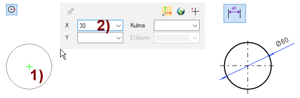 Syötä numeronäppäimistöltä säde (= kehäpisteen etäisyys keskipisteestä) pituus, esim. 30, kuvassa2).