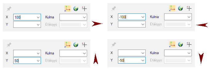 Positiivinen luku (Esim.: 100) = Viiva piirretään 100mm pitkäksi oikealle.