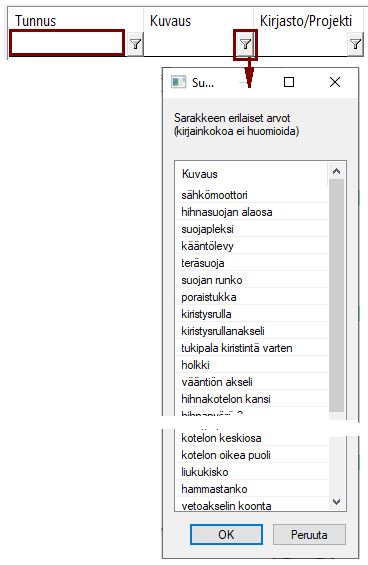 Valitse jokin rivi ja paina OK, jolloin ohjelma näyttää vain ne objektit, joilla valittu rivi esiintyy.
