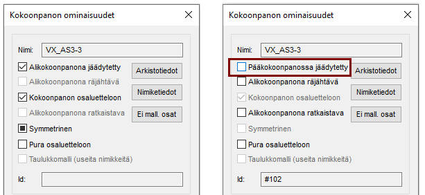 Kun halutaan että alikokoonpanon osat voivat liikkua omien vapausasteidensa mukaisesti myös pääkoonnassa on otettava valinta Pääkokoonpanossa jäädytettypois.